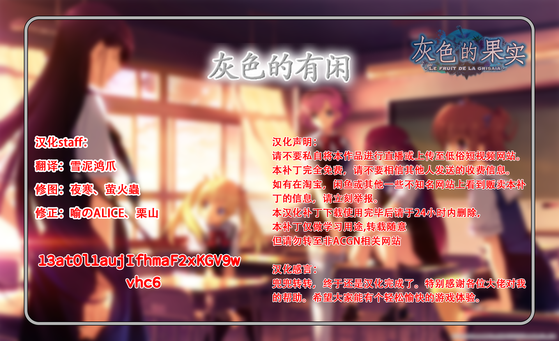 网页链接(tieba.baidu.com) 游戏已打【雪泥鸿爪个人汉化】2021.12.3发布的 灰色的有闲 V1.0全线汉化补丁 汉化版本:V1.0全线汉化版隐藏内容,请登录后查看