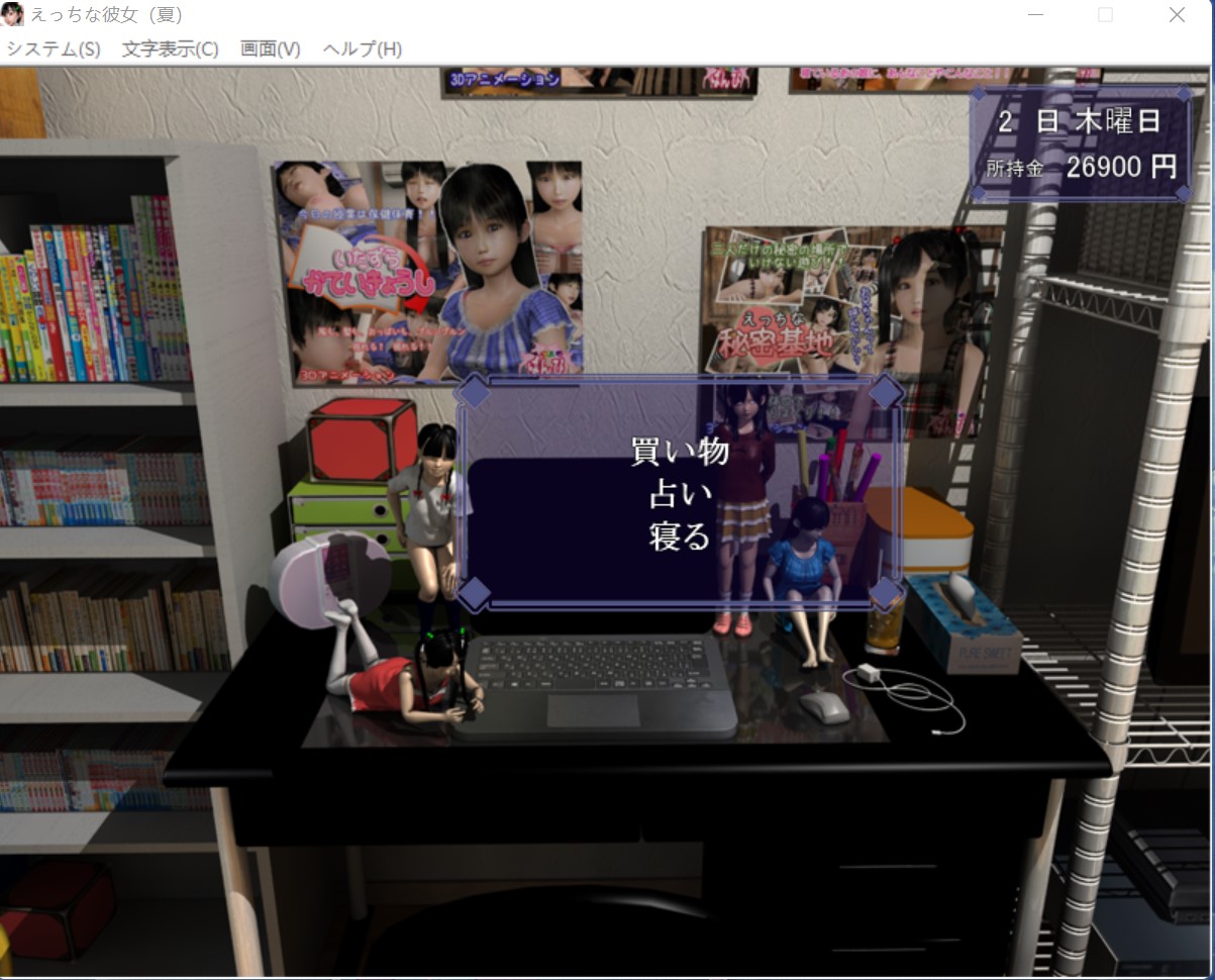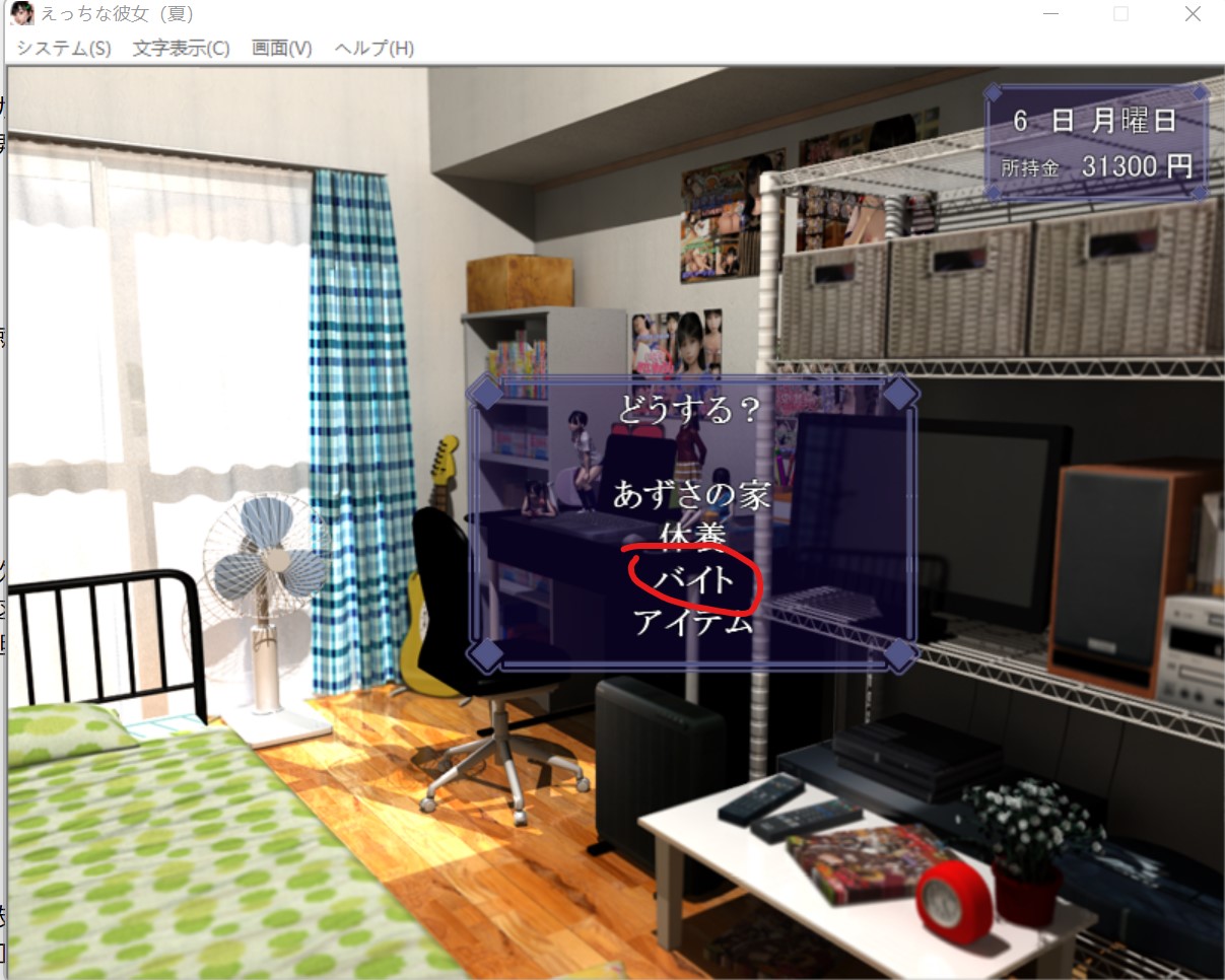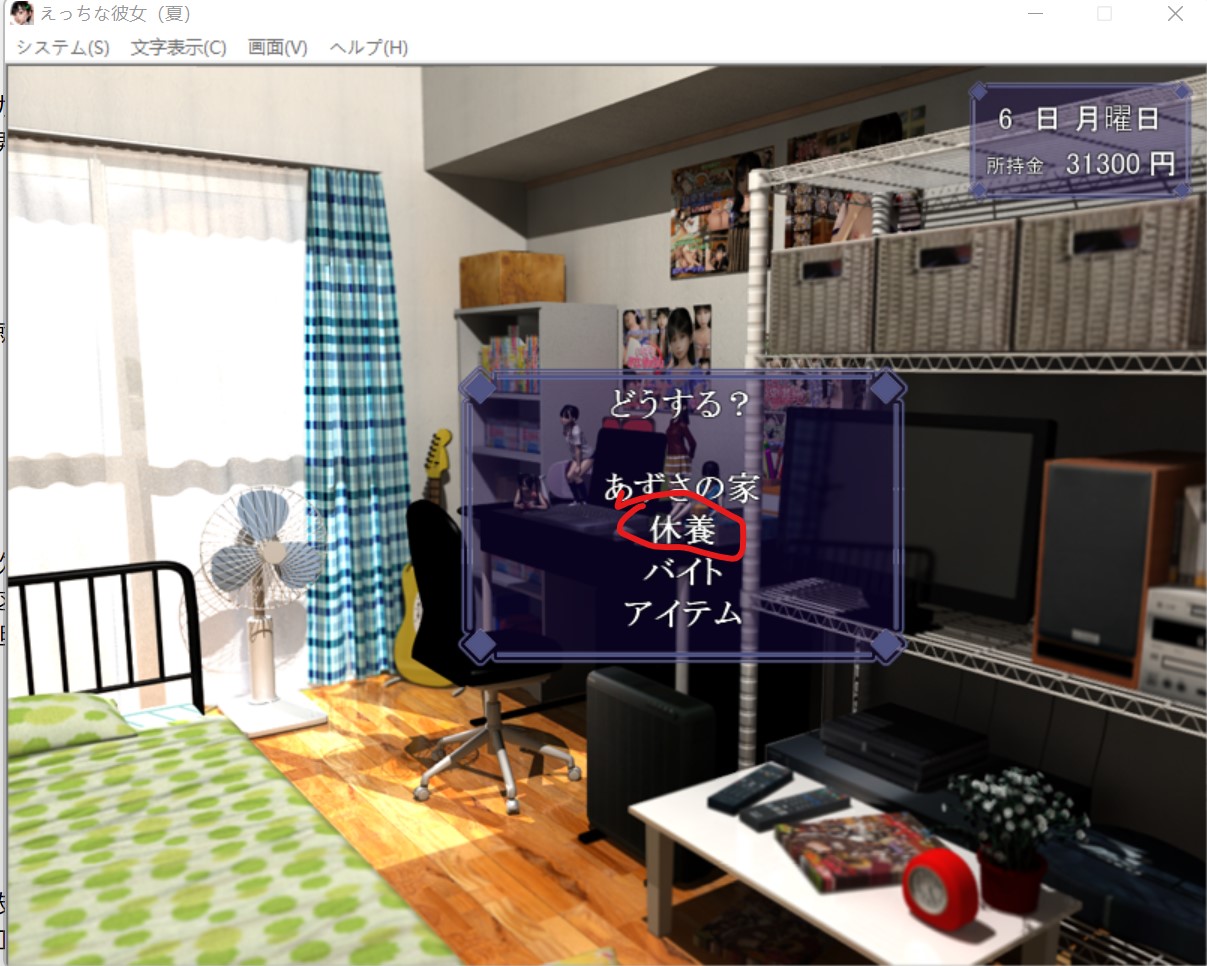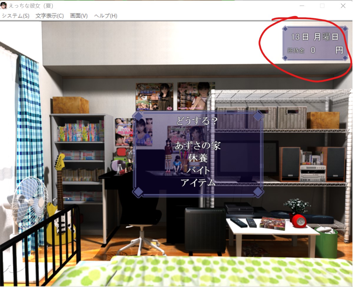 这个游戏采用的时间就跟现实时间一样,星期一到星期日。 早上只能干一件事,要么去找女朋友,要么去赚钱,要么就去休息 “木曜日”(星期四)是姐姐不在家,妹妹在家,前期的木曜日可以去打工或者休息(前期妹妹一个人在家,但是她当时不认识你,你去了她只会跟你讲说姐姐不在,让你回去,这样你就白白浪费半天的时间了。后期妹妹跟你熟了之后,你在木曜日去找她就能跟她做爱,触发属于妹妹的HCG。) 如果你想要知道妹妹对你怎么看的,也能在木曜日里去看看妹妹,一开始是不怎么讲话,好感度第二阶段会跟你讲几句,第三阶段会请你去打游戏,到第三阶段后再送妹妹一些东西提高好感度,等到后面去女朋友家里会触发妹妹的HCG(如图就是妹妹线激活了),此后在木曜日去女朋友家里就会触发妹妹的HCG,跟妹妹做爱。可以这么说:木曜日(星期四)女朋友不在家,妹妹在家,后期跟妹妹搞好关系后在木曜日去女朋友家可以去跟妹妹射。 火曜日(星期二)妹妹跟姐姐一定都在家,只有她们两个一起在家的时候你才能跟妹妹讲话,送妹妹东西,拉妹妹好感。注意:怎么送妹妹礼物? 当姐姐与妹妹同时在家的时候就可以送妹妹礼物 妹妹与姐姐在火曜日(星期二)的时候一定是都在家的,如果要送妹妹礼物就在这时候去,其他时间里妹妹与姐姐也可能也在家,但不是百分百在家,而火曜日的时候她们两个一定是都在家的。