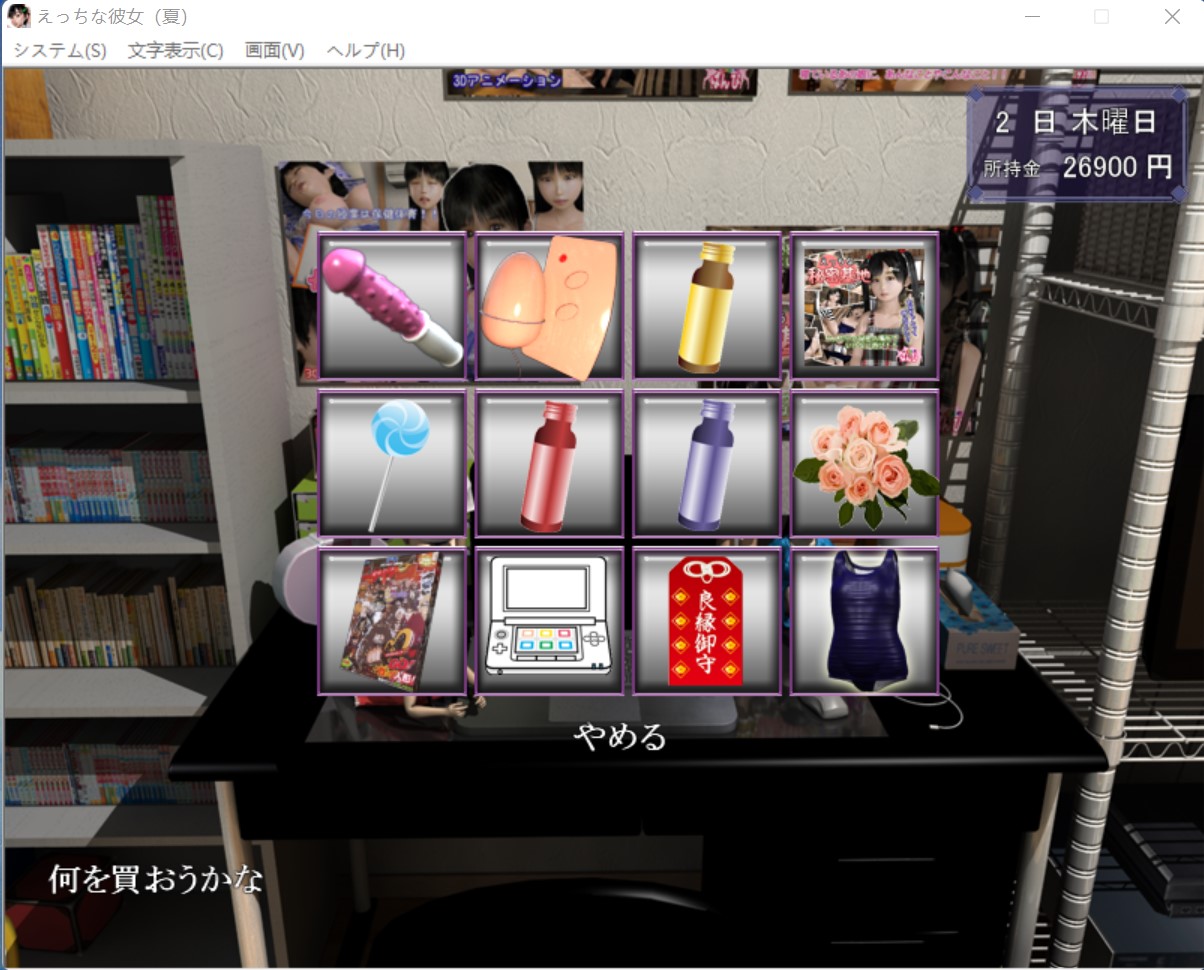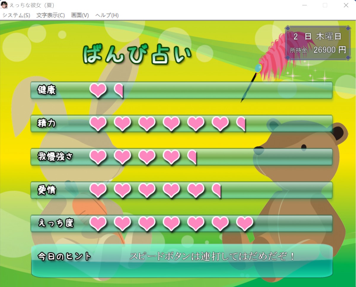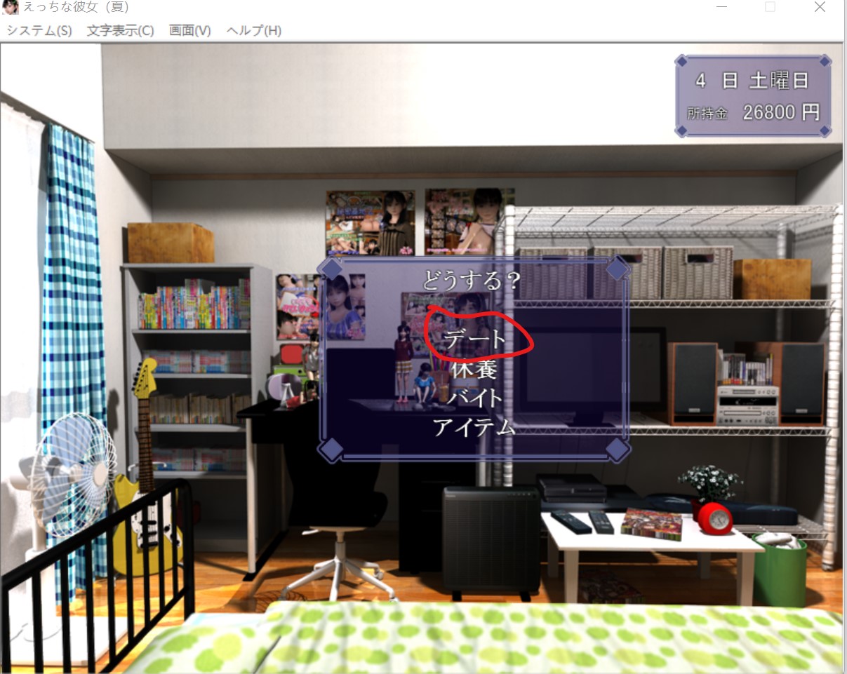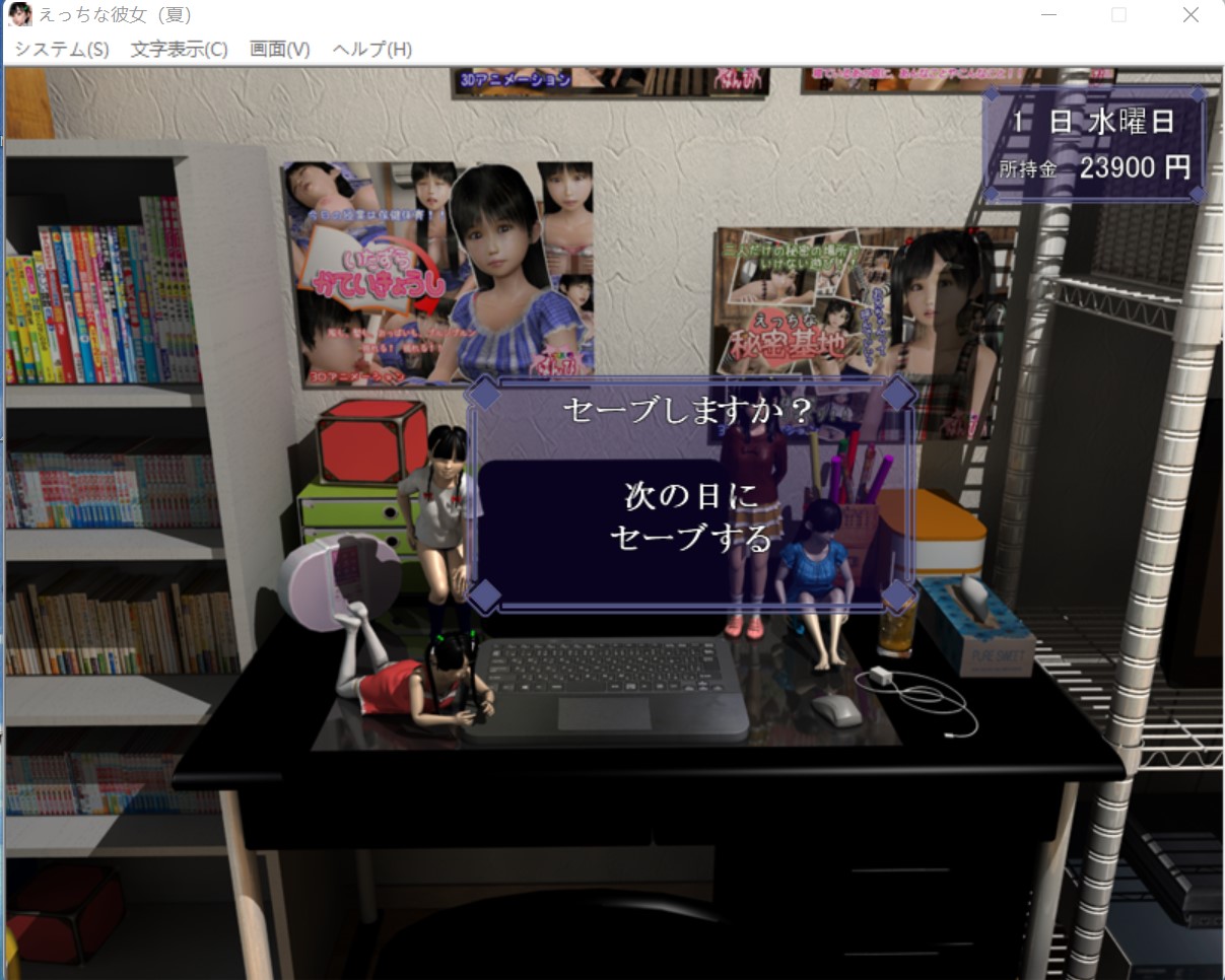 这个游戏采用的时间就跟现实时间一样,星期一到星期日。 早上只能干一件事,要么去找女朋友,要么去赚钱,要么就去休息 “木曜日”(星期四)是姐姐不在家,妹妹在家,前期的木曜日可以去打工或者休息(前期妹妹一个人在家,但是她当时不认识你,你去了她只会跟你讲说姐姐不在,让你回去,这样你就白白浪费半天的时间了。后期妹妹跟你熟了之后,你在木曜日去找她就能跟她做爱,触发属于妹妹的HCG。) 如果你想要知道妹妹对你怎么看的,也能在木曜日里去看看妹妹,一开始是不怎么讲话,好感度第二阶段会跟你讲几句,第三阶段会请你去打游戏,到第三阶段后再送妹妹一些东西提高好感度,等到后面去女朋友家里会触发妹妹的HCG(如图就是妹妹线激活了),此后在木曜日去女朋友家里就会触发妹妹的HCG,跟妹妹做爱。可以这么说:木曜日(星期四)女朋友不在家,妹妹在家,后期跟妹妹搞好关系后在木曜日去女朋友家可以去跟妹妹射。 火曜日(星期二)妹妹跟姐姐一定都在家,只有她们两个一起在家的时候你才能跟妹妹讲话,送妹妹东西,拉妹妹好感。注意:怎么送妹妹礼物? 当姐姐与妹妹同时在家的时候就可以送妹妹礼物 妹妹与姐姐在火曜日(星期二)的时候一定是都在家的,如果要送妹妹礼物就在这时候去,其他时间里妹妹与姐姐也可能也在家,但不是百分百在家,而火曜日的时候她们两个一定是都在家的。