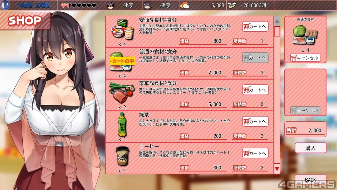 返家後,還可以選擇去超市、藥店等地購買食材、甜點等道具來討女主角的歡心。像是如果願意使用高級食材作飯或購買甜點的話,夏帆的心情就會變得比較好。