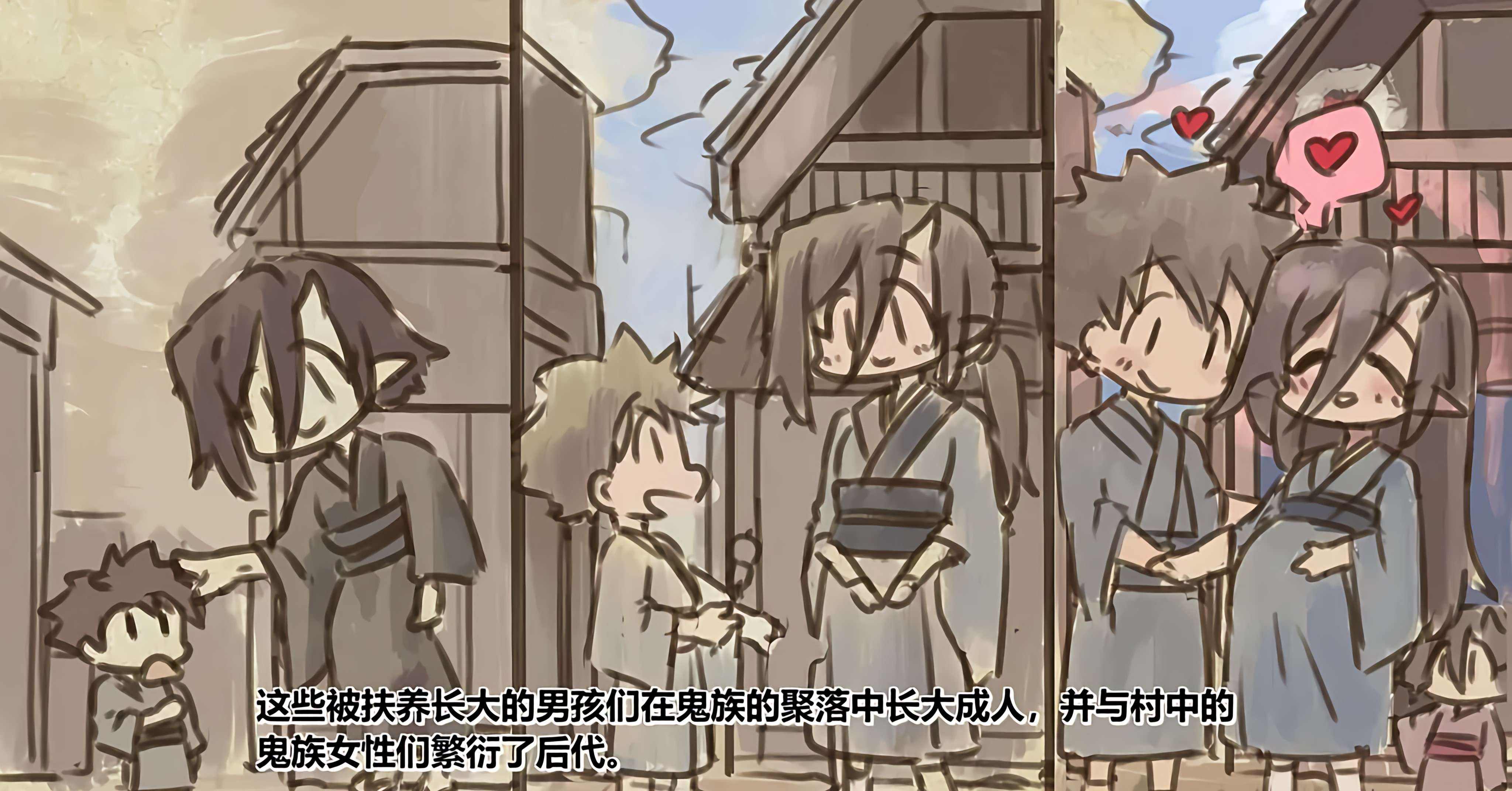 于是,鬼们开始收养被遗弃或走失的人类男性幼崽,这些男孩在鬼族的村庄长大,被大家视为村子的一员,并与村里的鬼族少女生下子嗣。