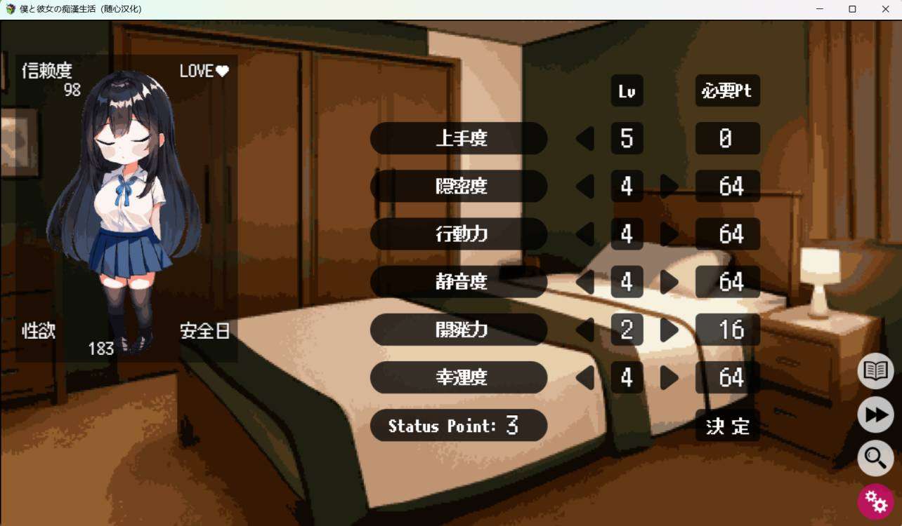 技能点的话优先点提快感和降警戒度比较好,其实问题都不大,这游戏数值好容易提,游戏内容几个小时就体验完了。
