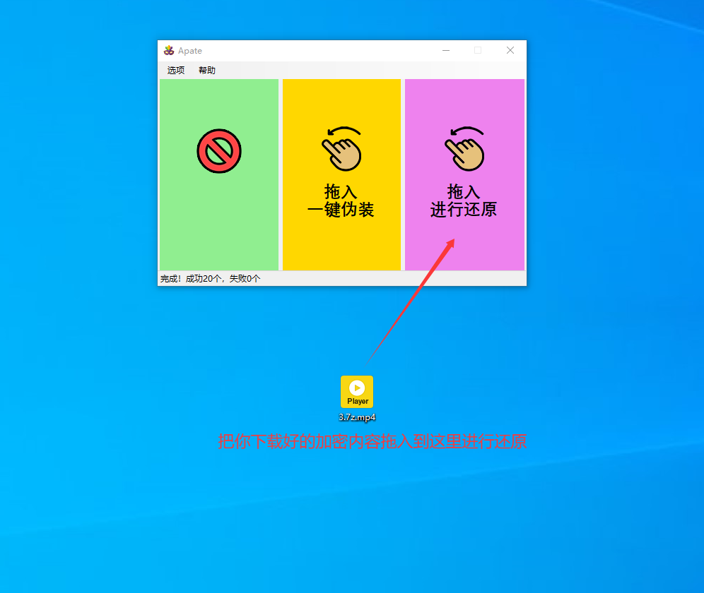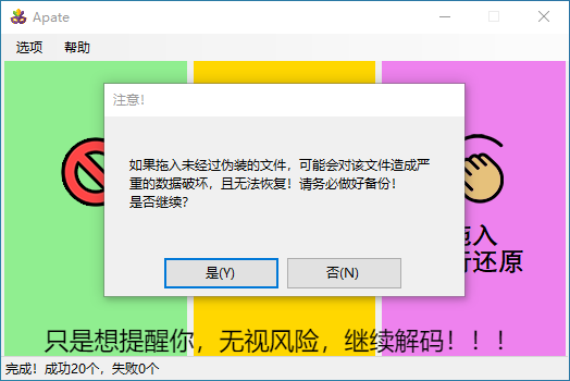 使用办法非常简单,直接把需要解码的视频拖入到“拖入进行还原”,无视风险继续解码,就出来了,直接解压即可!!!