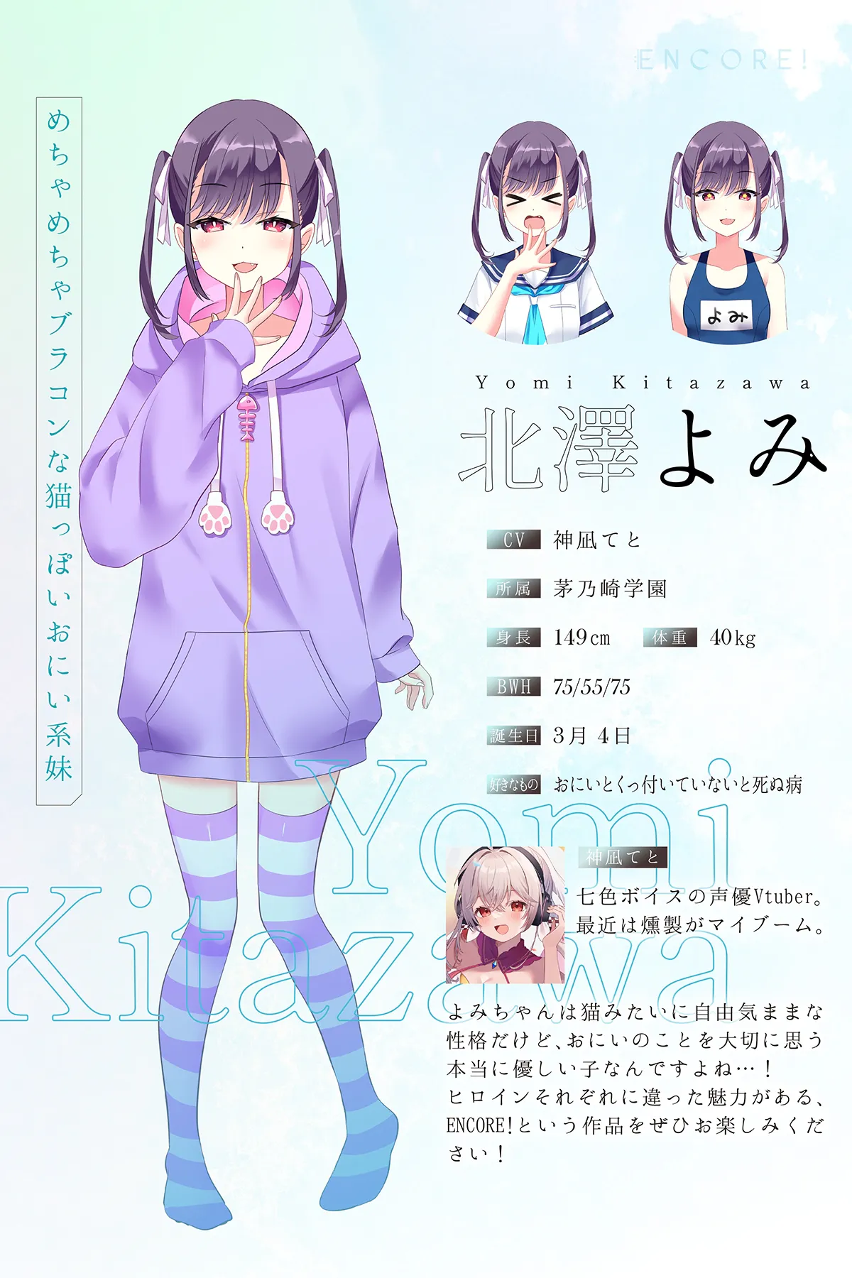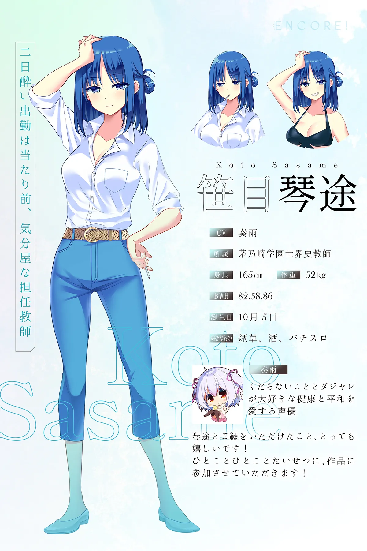 宿醉上班是家常便饭,脾气古怪的班主任 Koto Sasame 能与琴途结缘,我感到非常开心!我会珍视每一句话,认真参与这部作品的制作! |