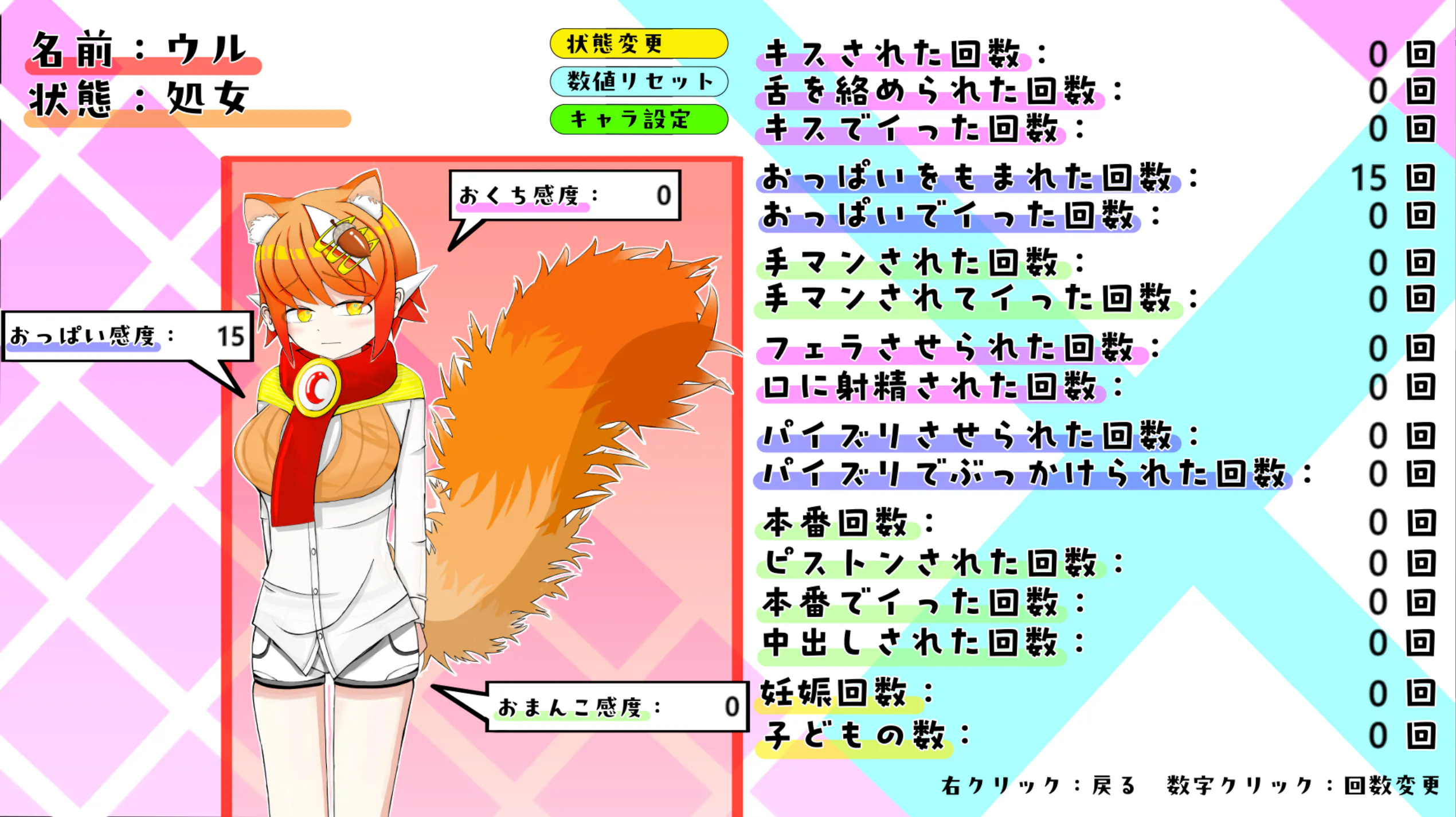 ●可修改的色情状态! 本作品有色情状态,可以查看乌尔酱各部位的敏感度、接吻和孩子的次数等性骚扰次数、处女或大肚子等状态、以及乌尔酱的角色设定。 此外,敏感度、性骚扰次数、状态可以根据喜好自定义。 可以将非处女变回处女,反复夺走第一次;可以设为已接吻或已怀孕,营造寝取风格;也可以将敏感度设为3000,享受一碰就高潮的乌尔酱……各种玩法皆有可能。