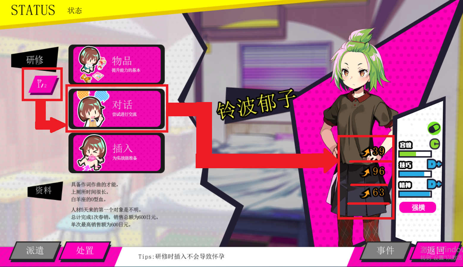 在多拿多拿中,想要使人才的“三围”数值变化最简便的方式就是在人才的详细页面中消耗TP(行动力)进行对话或者是插入。