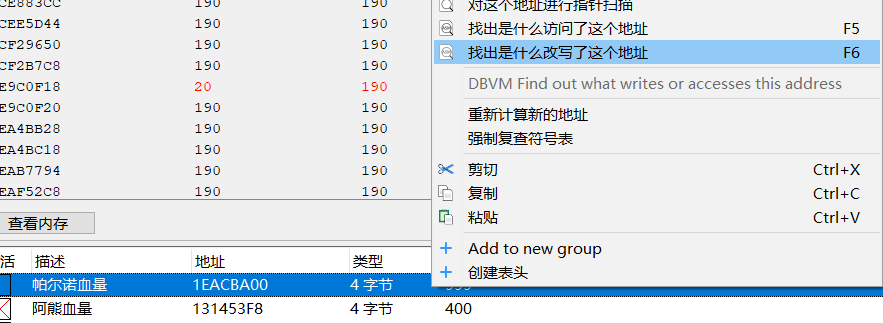 可以注意到在左侧搜索到的数据中,无论数据如何变化,仅有先前值和当前值会被染上红色,而左边的地址列只分为绿色地址和黑色地址。